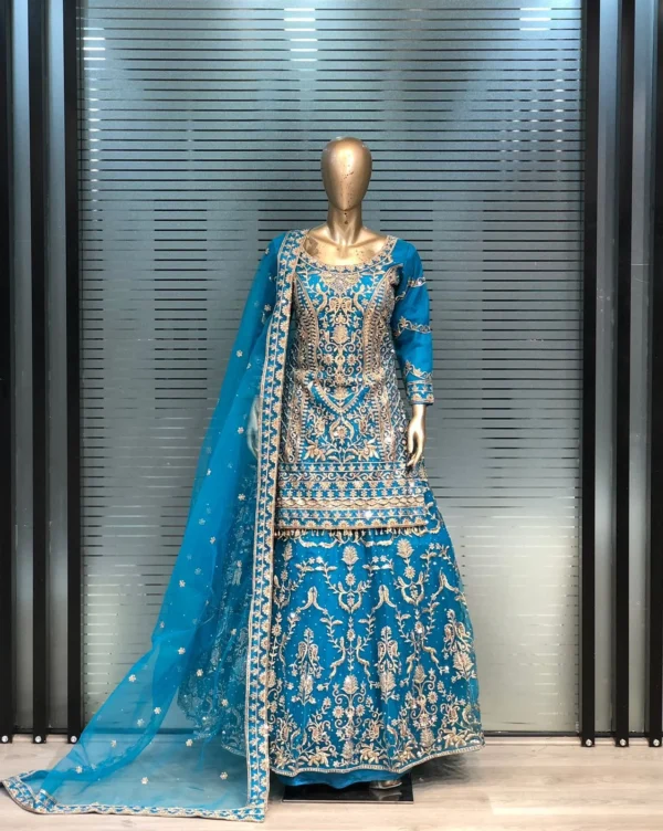 Dazzle on your special day with our stunning “Long Top Blue Lehenga” paired with a long heavy work choli.