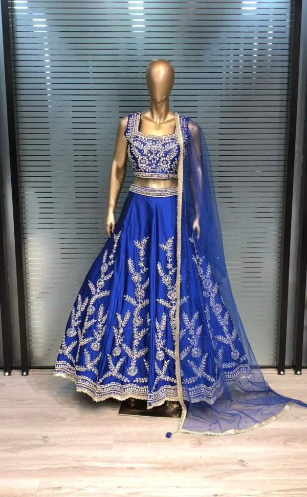 Turn heads with thisĀ Blue Lehenga Choli, garnished with intricate Silver work that exudes luxury and sophistication. Perfect for weddings and festive occasions, the rich color and delicate detailing make this ensemble a regal choice for the modern woman.