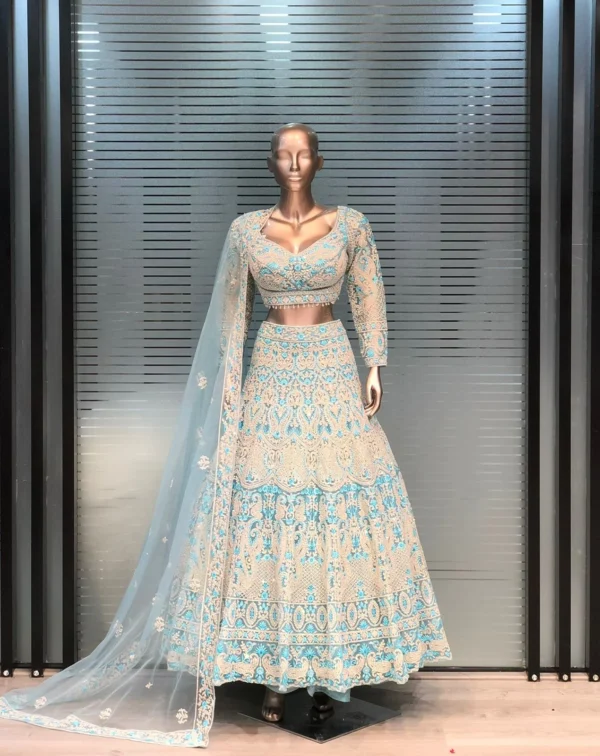 This Blue lehenga choli features intricate embroidery and sequins, creating a shimmering effect. The V-neck choli has short sleeves and a fitted top that gently flares around the midriff, while the lehenga flows in a flared style with detailed circular motifs and embroidery extending to the hem. Paired with a net dupatta, embroidered with a subtle pattern, this ensemble offers a refined and graceful look.
