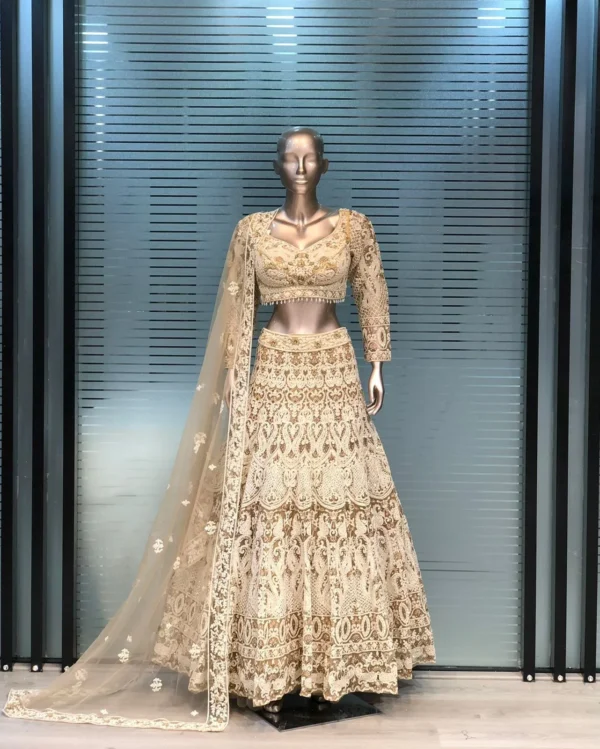 This Golden yellow colour lehenga features intricate embroidery and sequins, creating a shimmering effect. The V-neck choli has short sleeves and a fitted top that gently flares around the midriff, while the lehenga flows in a flared style with detailed circular motifs and embroidery extending to the hem. Paired with a net dupatta, embroidered with a subtle pattern, this ensemble offers a refined and graceful look.
