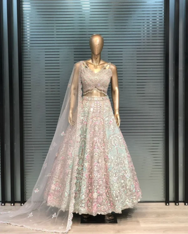 This pastel lehenga set features multi-colored panels. the skirt is paired with a fully embroiderd. This perfect blend of rich embellishments and lively colors, this ensemble is ideal for any festive occasion, exuding charm, grace, and a touch of sparkle.