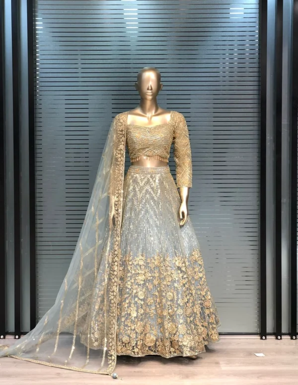 The Sky Blue Lehenga Choli with Net Dupatta is a graceful and stylish ensemble. The lehenga features hand work Lehenga, paired with a matching choli in a soft powder blue hue.